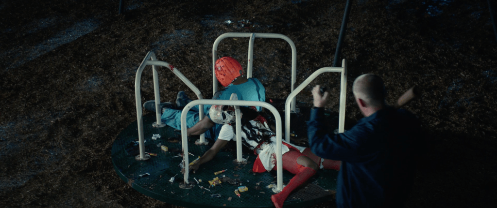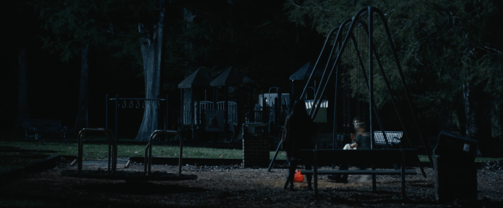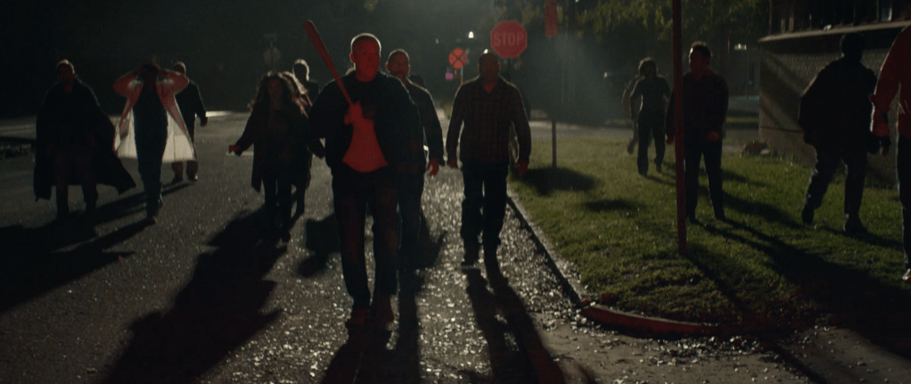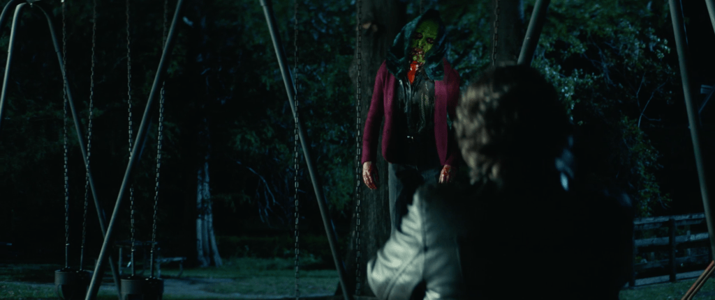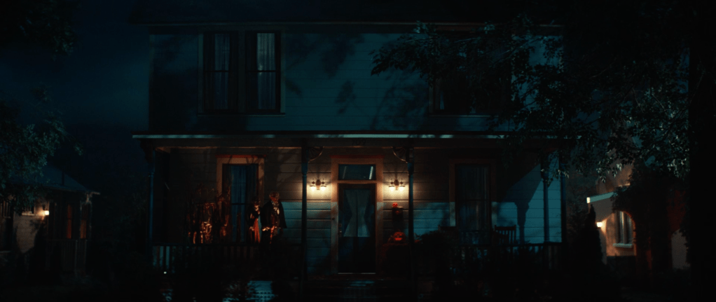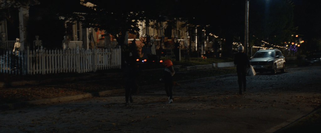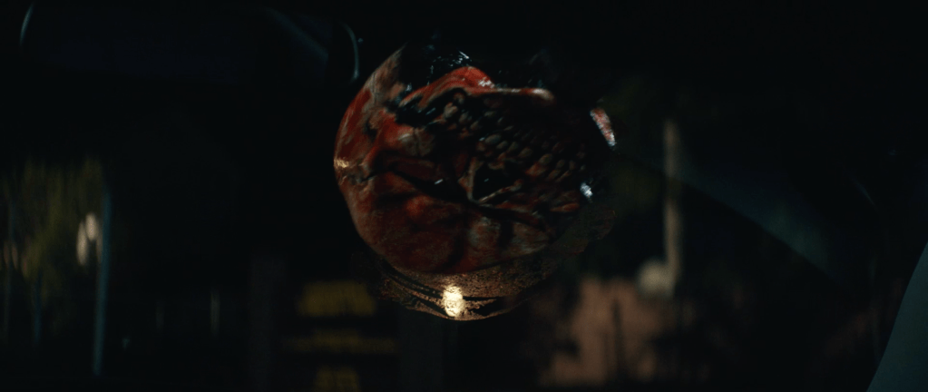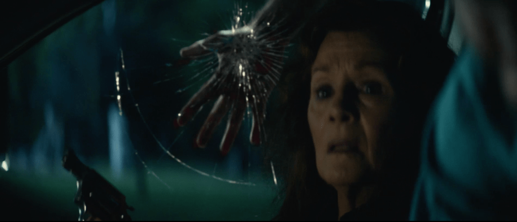 The trailer starts and in a quick blink and you miss it shot, we see 3 kids wearing the Silver Shamrock masks from Halloween III: Season of the Witch. These could be the same kids who were wearing them in 2018’s Halloween (which will henceforth be referred to as H18) but that’s a stretch. We then see Lindsay Wallace, once again played by Kylie Richards over 40 years since 1978’s Halloween (which will henceforth be referred to as H78) telling some kids to go home but they say they’re “playing hide and seek” with the man in the white mask. Wallace immediately panics and we see a Mr Michael Myers with a bloody Silver Shamrock mask, specifically the skull one (he seems to be holding that for the majority of the trailer. He could possibly be covering up his hand where he lost a few fingers via shotgun) make his grand appearance. Wallace then tells the kids to run as wee see a family attacked in their car by Myers in a similar way that he attacked Marion Chambers in H78. He attacks from the top of a car and proceeds to break the car windows and kill the people inside of it