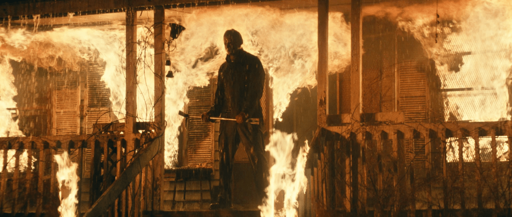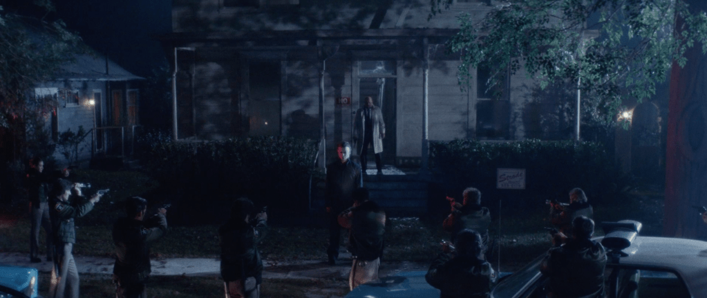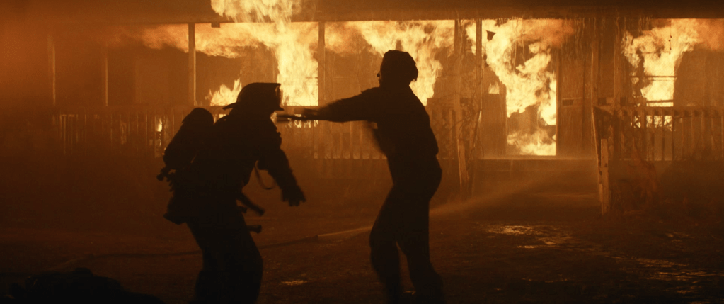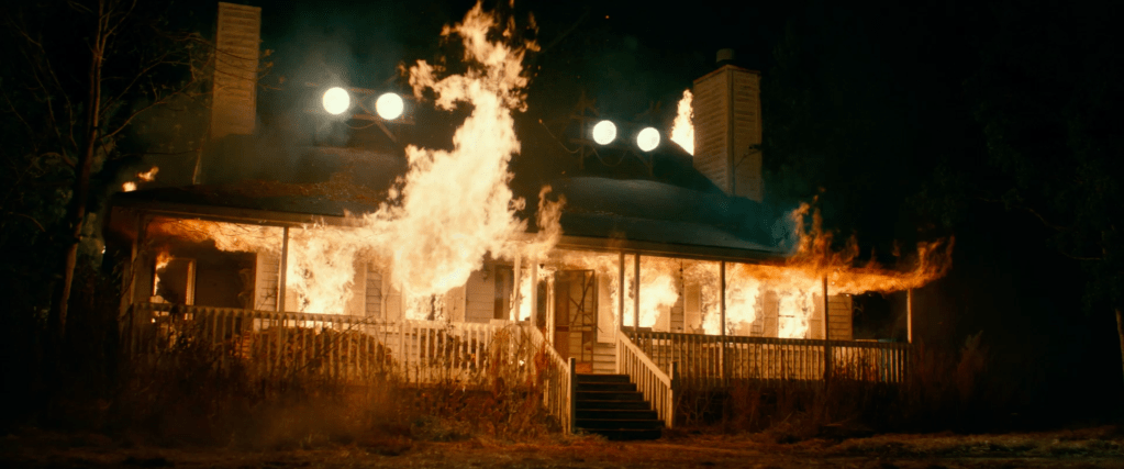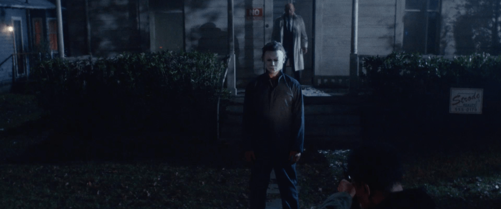 Cut to studio cards then a scene of the Strode household burning and we see that the Strode women tell their story of how they “killed” Michael Myers while it cuts to scenes of Myers killing the firemen and escaping. The women are then informed that Myers lived and we see the horror on their faces.