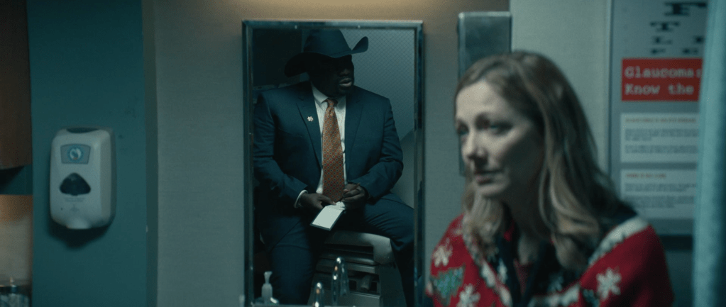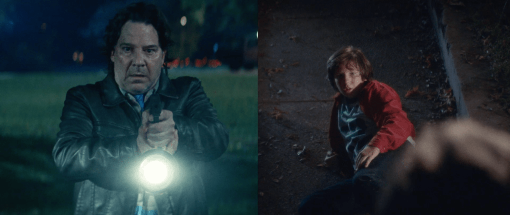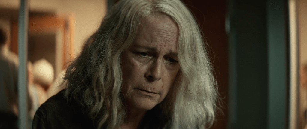 We then cut to a really cool shot that showcases all the survivors of Myers’ original rampage in H78. These people include Laurie Strode, along with the 2 children she baby sat in H78, Lindsay Wallace and Tommy Doyle. Also included is Lonnie Elam, Doyle’s childhood bully. We see them in a Now VS then format that is something very interesting and a cool design choice that was well done.