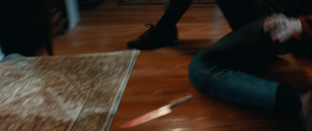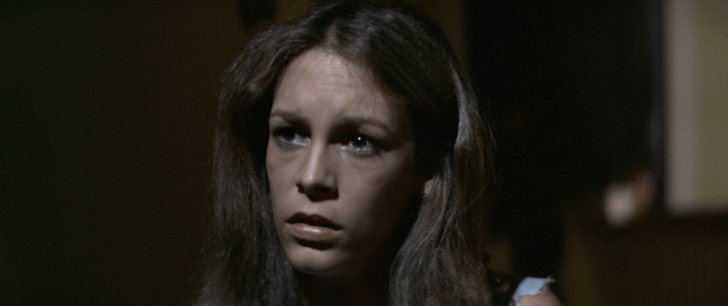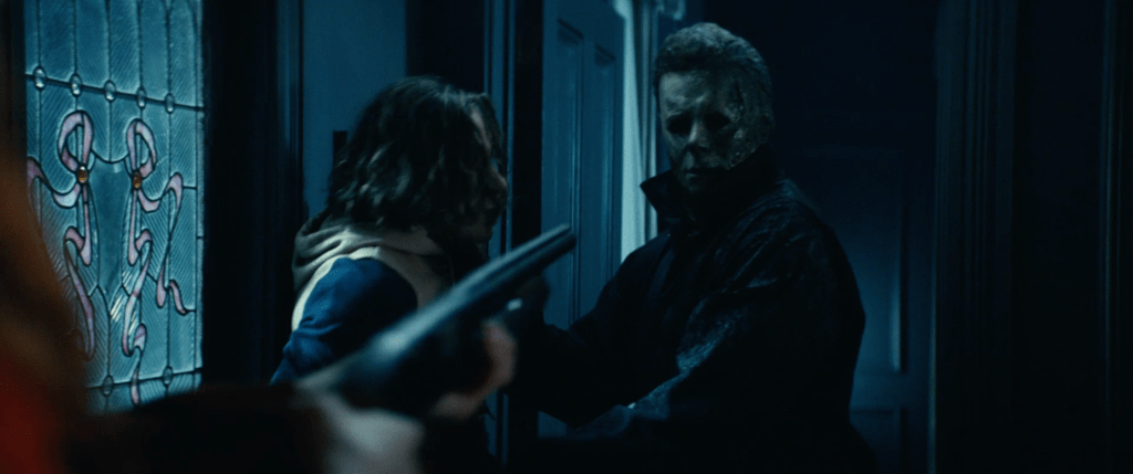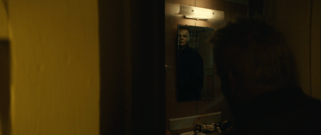 So, we then cut to Michael ready to kill Alison’s ex boyfriend Cameron as she falls down the stairs, snapping her legs and while we don’t see him finish Cameron off, we can infer it. We then see her leg snap and we cut to Karen strode where we see Karen Strode running with Micheal’s mask as a maskless Myers follows her.