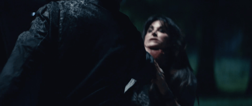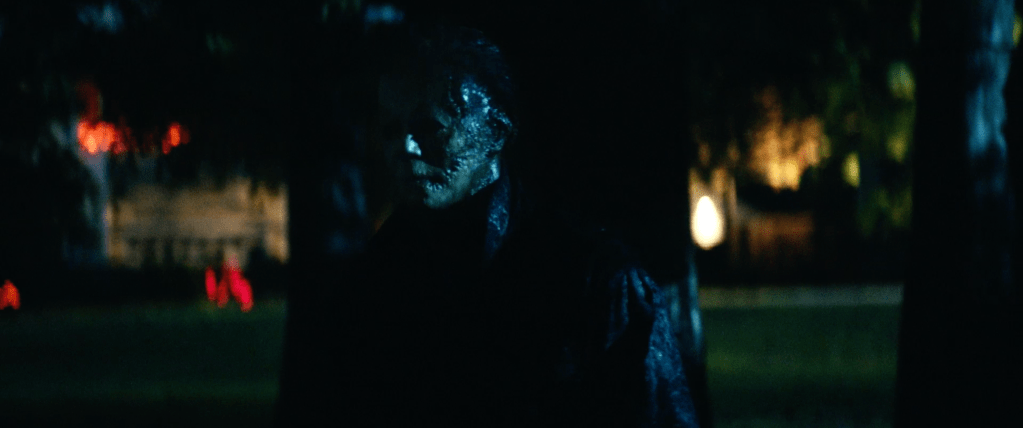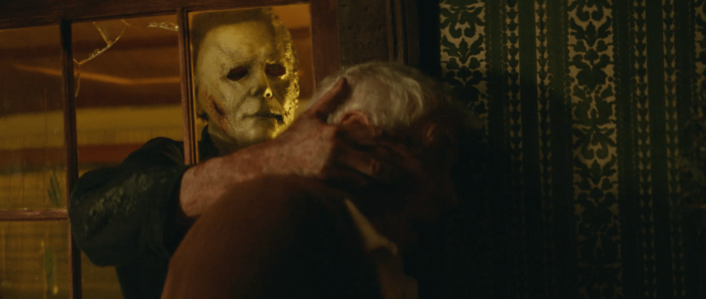 We then get something incredible. We get flashbacks to scenes from the first film including a 6 year old boy with the blackest eyes and a flashback to Myers’ arrest after the events of H78 which include a look at Doctor Sam Loomis, who was previously played by the late, great Donald Pleasance. We also see a Strode Realty sign as Laurie’s father was selling that home. We then see Myers attacking Lindsay Wallace before Laurie talks about something that fans of the franchise have clamoured for since the first film, seeing Myer’s face.